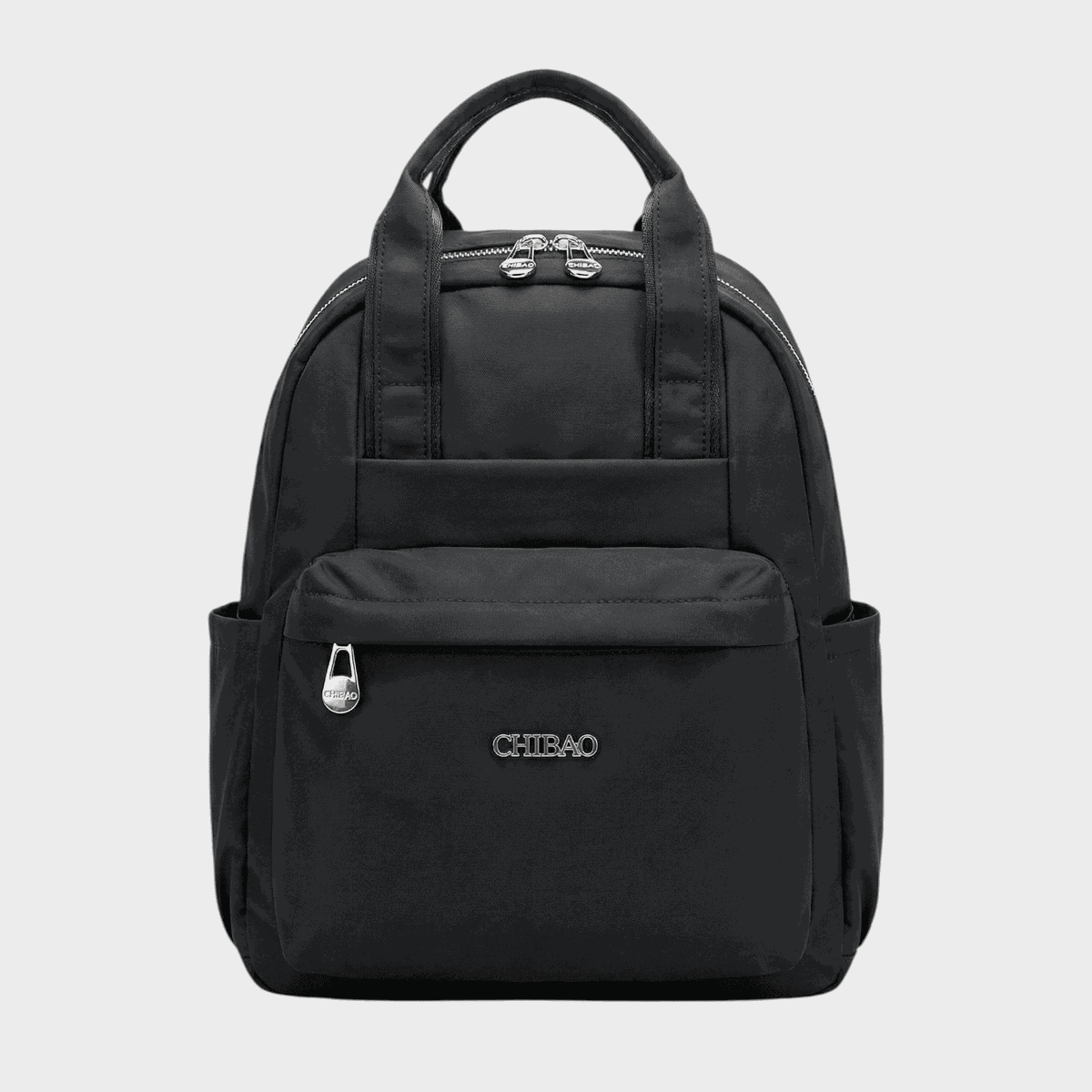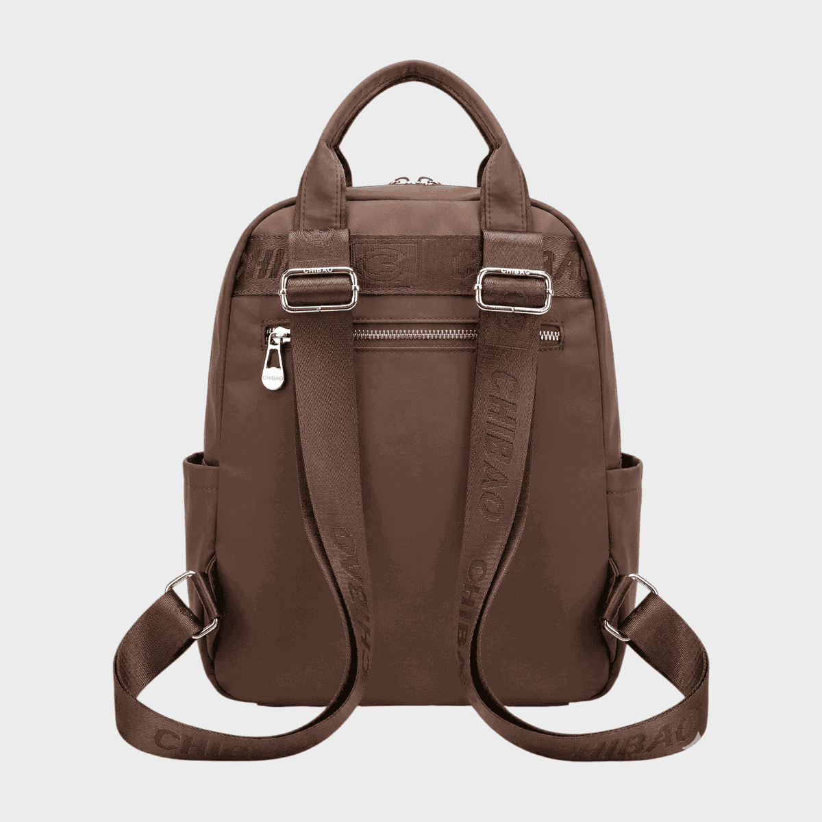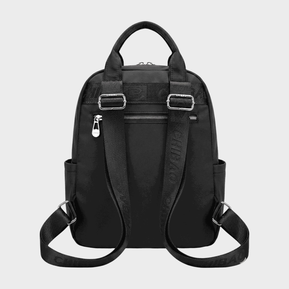 - Descripción: Bolsillo principal amplio con compartimientos, dos bolsillos internos con cierre. Presenta 2 cierres externos, 1 en parte posterior. Bolsillo delantero con broche. Porta botellas en ambos lados.